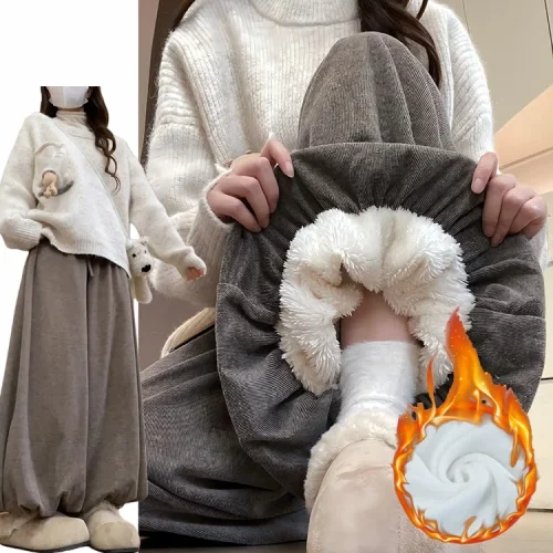 카라멜 두꺼운 하이웨이스트 블루머 팬츠 여성용 가을 겨울 신상 니트 부드러운 따뜻한 플리스 안감 롱 스커트 팬츠