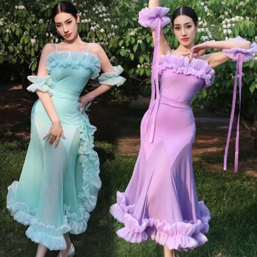 2022 볼룸 댄스 대회 드레스 여성 레이스 프릴 오프 숄더 탑 스커트 댄스 파티 드레스 왈츠 공연 의상 BL8621