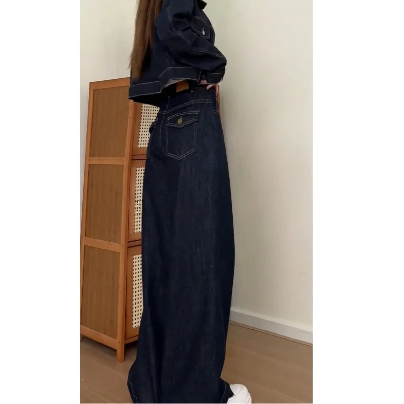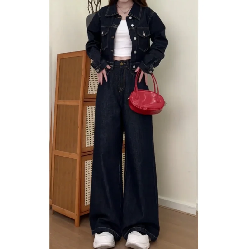 미국 스타일 레트로 하이 스트리트 섹시 걸 드레이프 데님 팬츠 여성용 봄 가을 소형 사이즈 하이 웨이스트 루즈 스트레이트 레그 플로어 렝스 팬츠