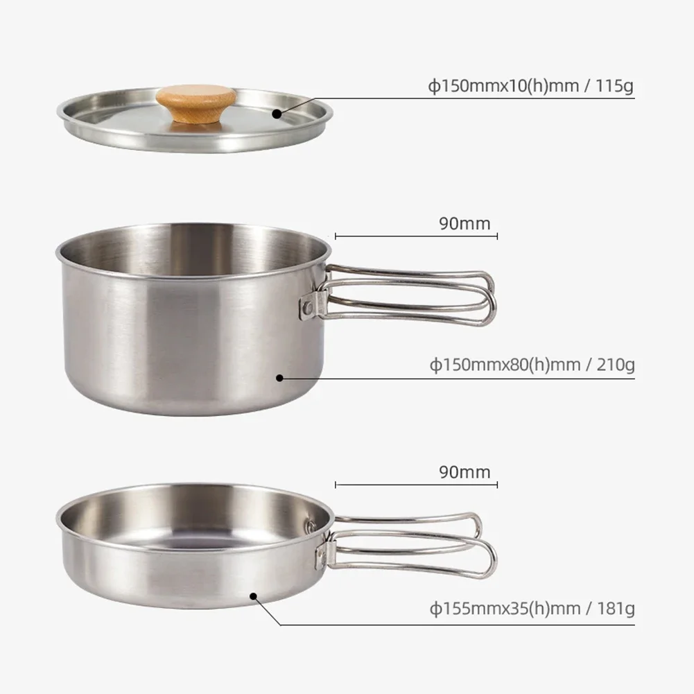 재질: 304 스테인레스 스틸, 나무 손잡이 크기: 냄비: 직경 15cm/5.9in, 높이 8cm/3.2in, 손잡이 9cm/3.5in 팬: 직경 15.5cm/6.1in, 높이 3.5cm/1.4in, 손잡이 9cm3.5in 용량: 냄비 1.4L, 팬 0.7L 무게: 냄비 210g, 팬 181g, 530g 1세트(보관백 포함) 메모: 1 x 냄비