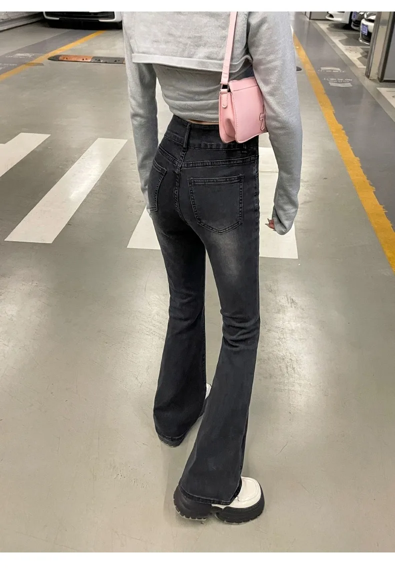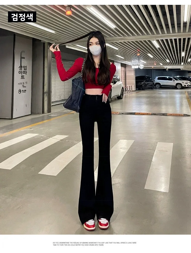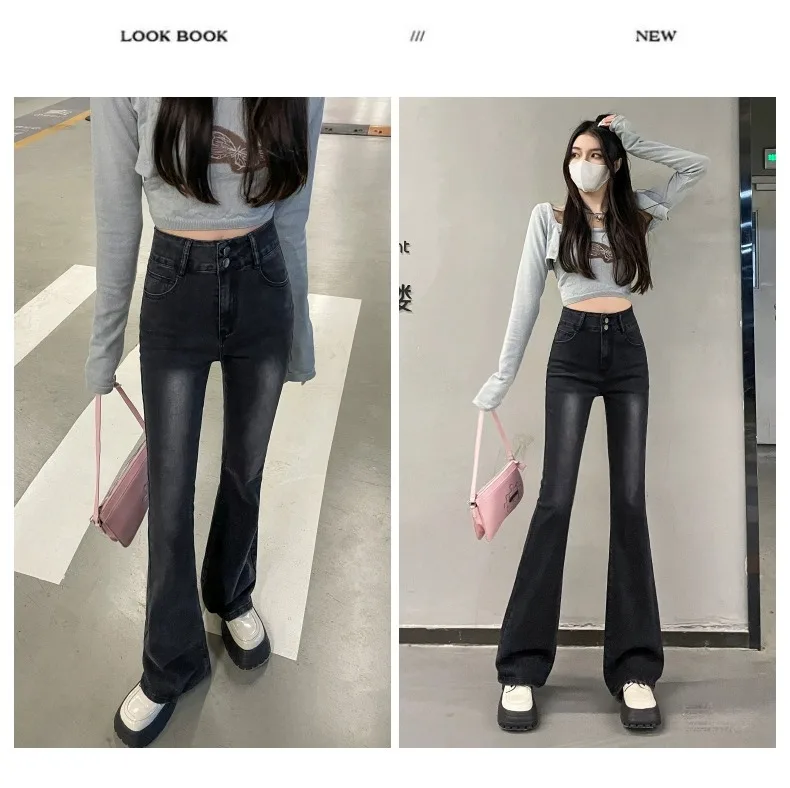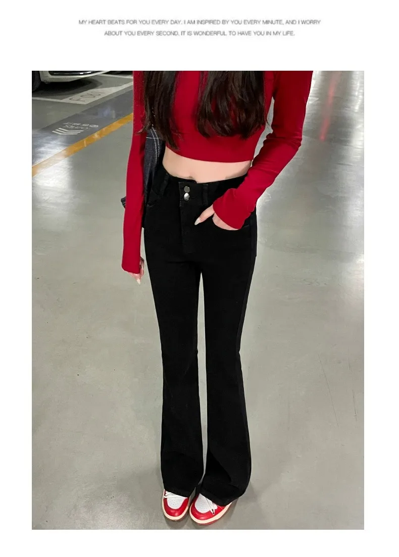양털 안감 두꺼운 하이 웨이스트 슬림 피트 부츠컷 청바지 여성용 아메리칸 스타일 블랙 그레이 데님 바지 가을 겨울 패션