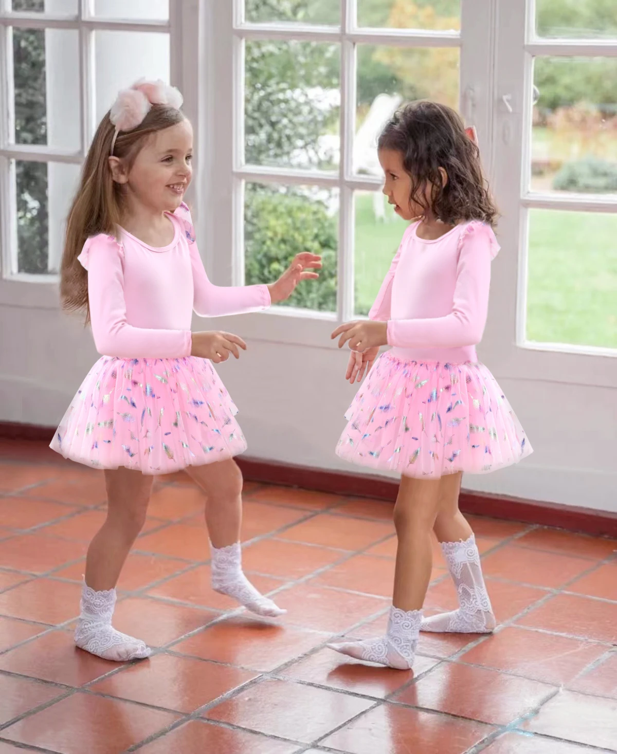 화려한 깃털 프린트가 돋보이는 투투 스커트는 스타일리시하고 매력적이며 춤을 출 때 소녀들을 요정처럼 만들어줍니다.떨어지기 쉽지 않은 고품질 공예품.