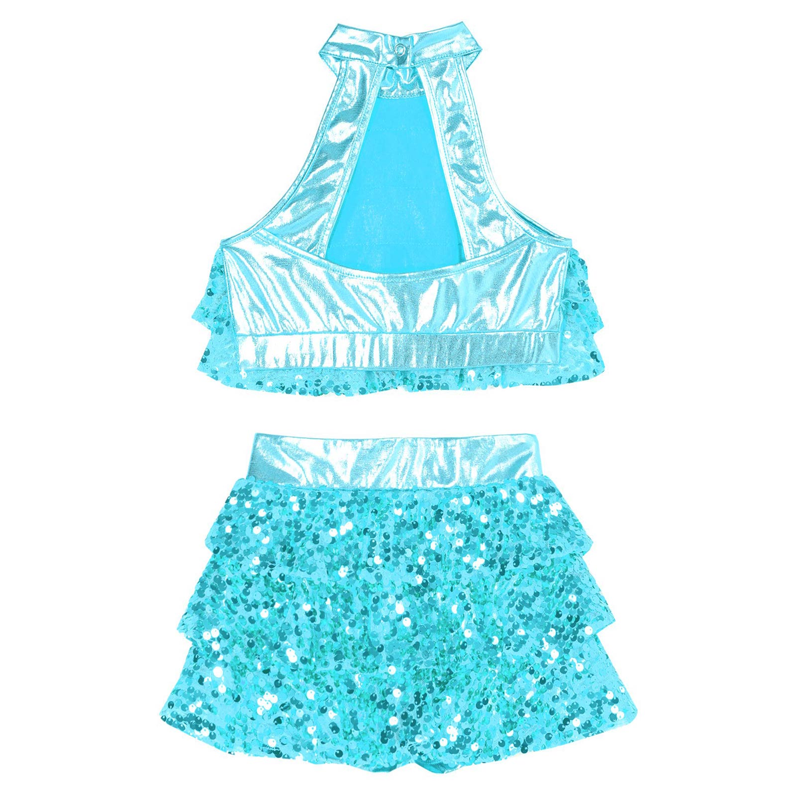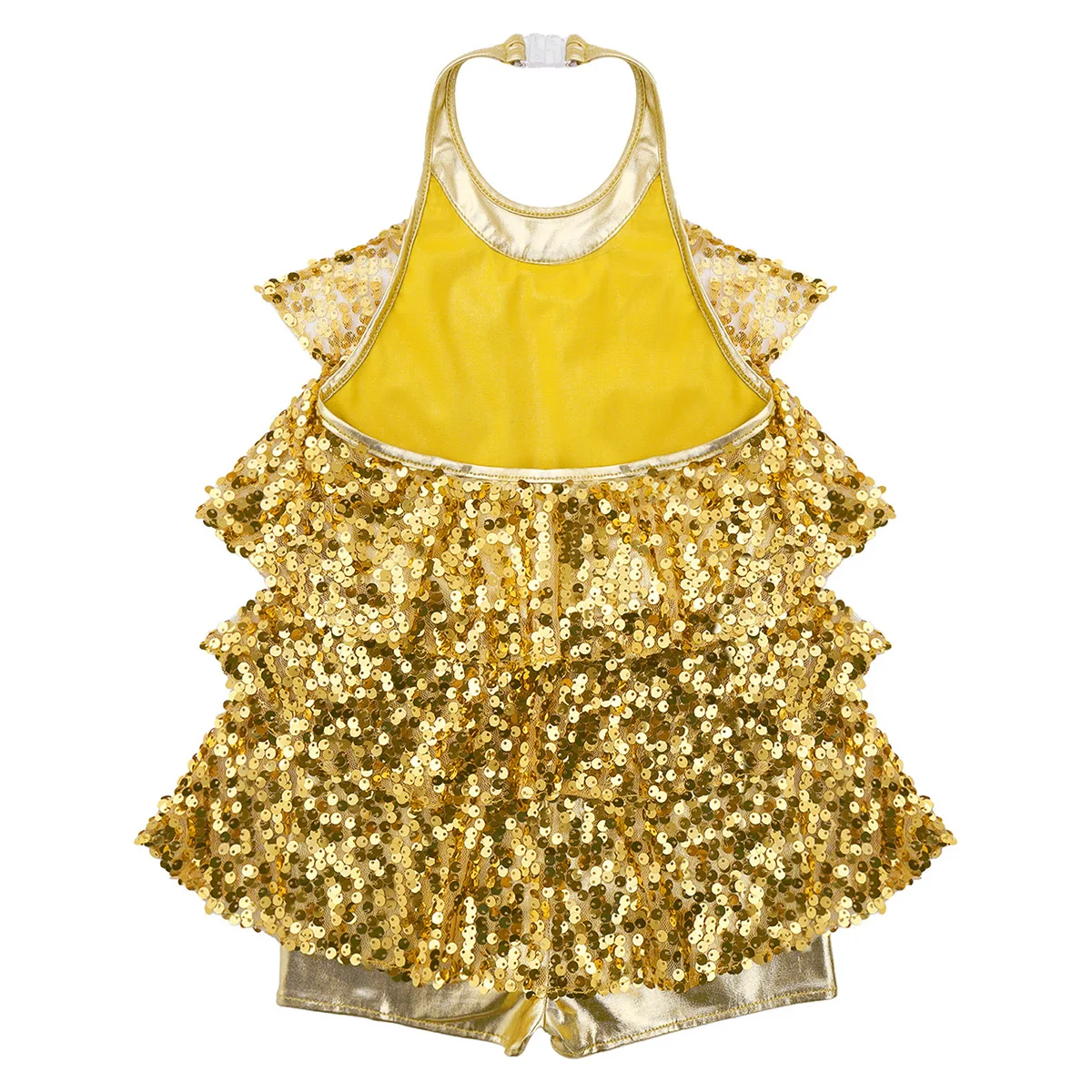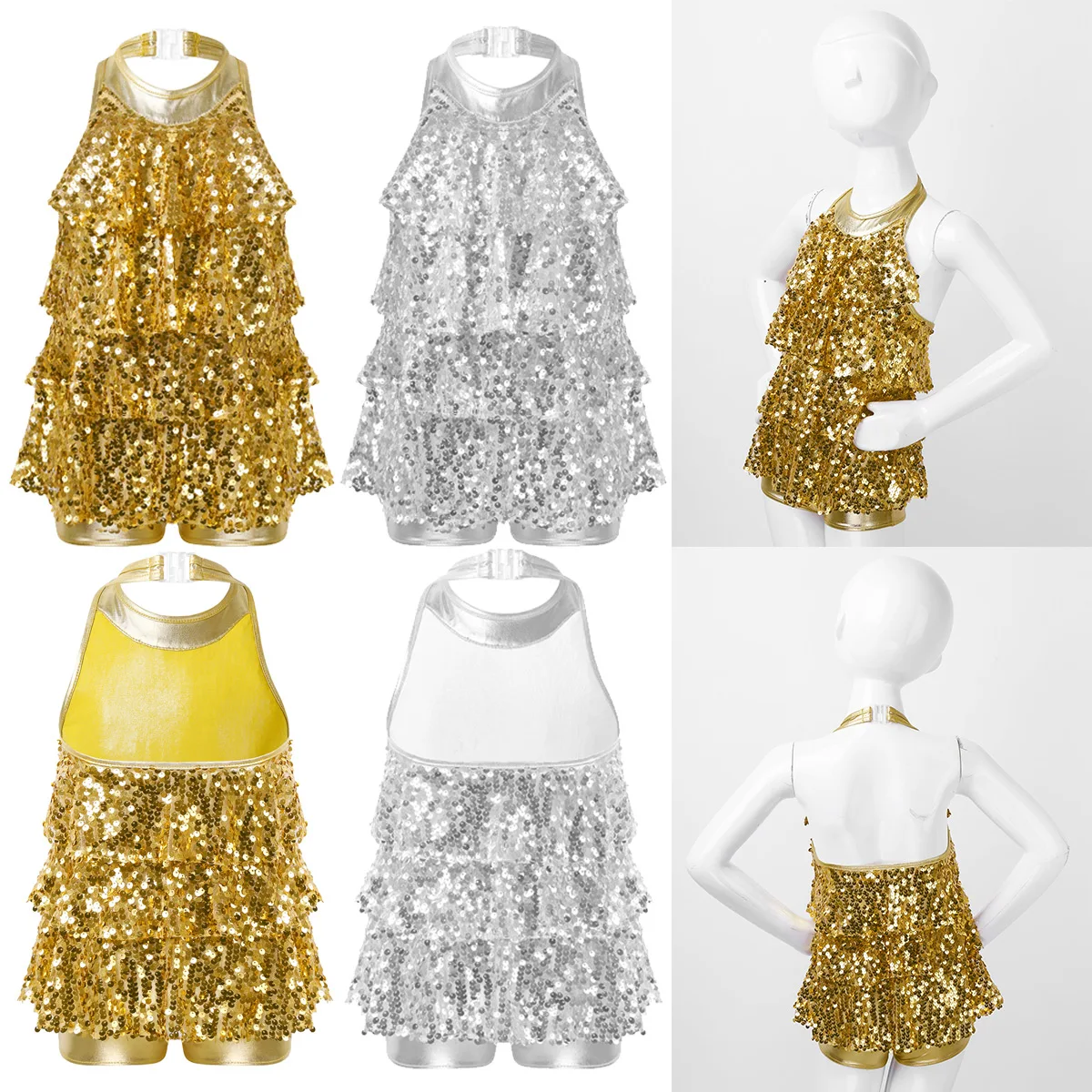 키즈 홀터 반짝 이는 스팽글 체조 쇼티 유니타드 드레스 소녀 발레 레오타드 무대 공연 라틴 재즈 댄스 의상