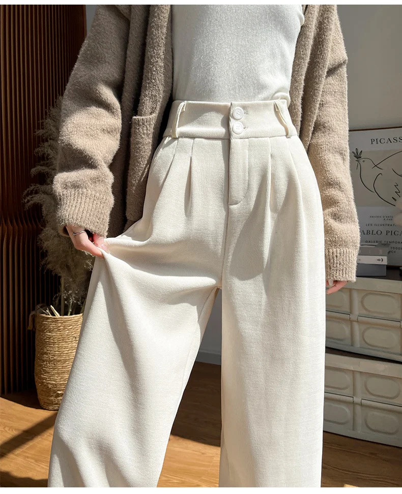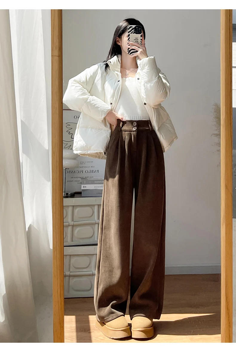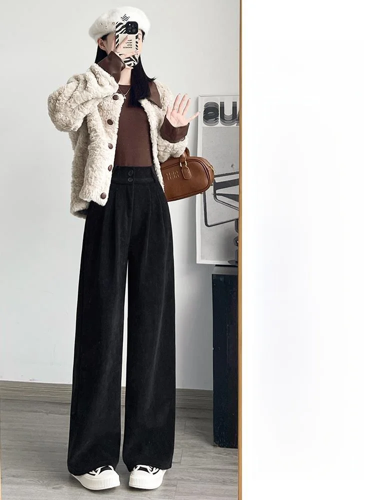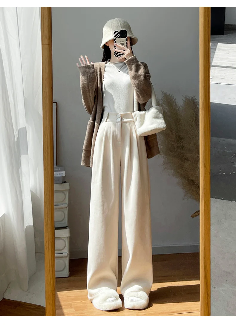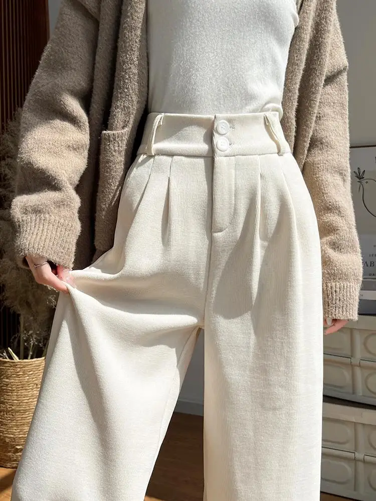 화이트 코듀로이 와이드 레그 팬츠 여성 가을 겨울 신상 슬림 스트레이트 드레이프 스몰 사이즈 플리스 안감 정장 바지 출퇴근 스타일 하이웨이스트