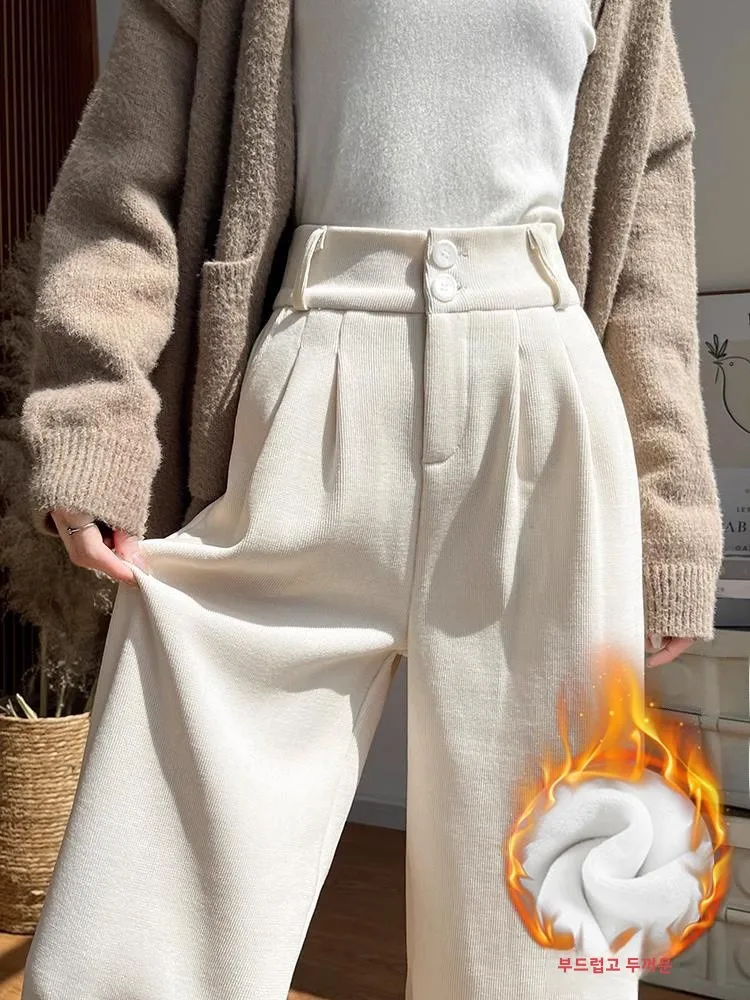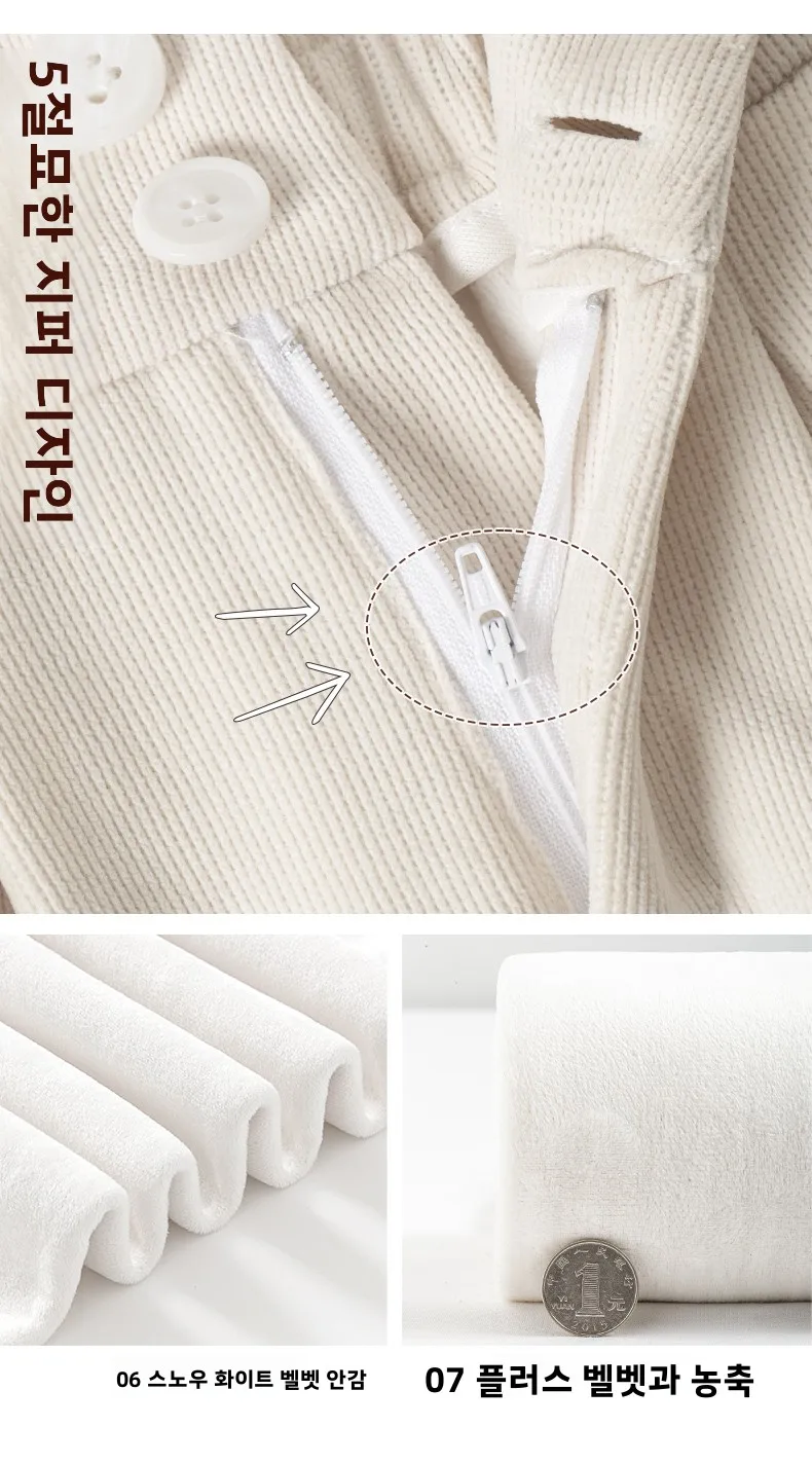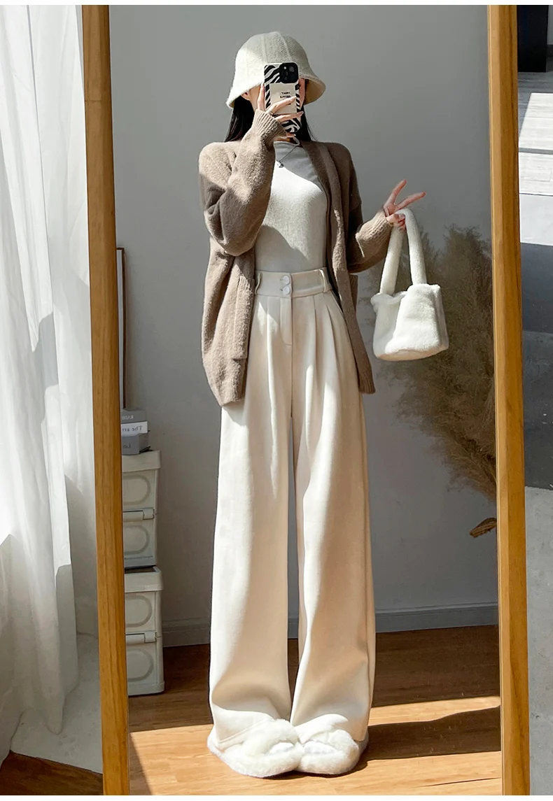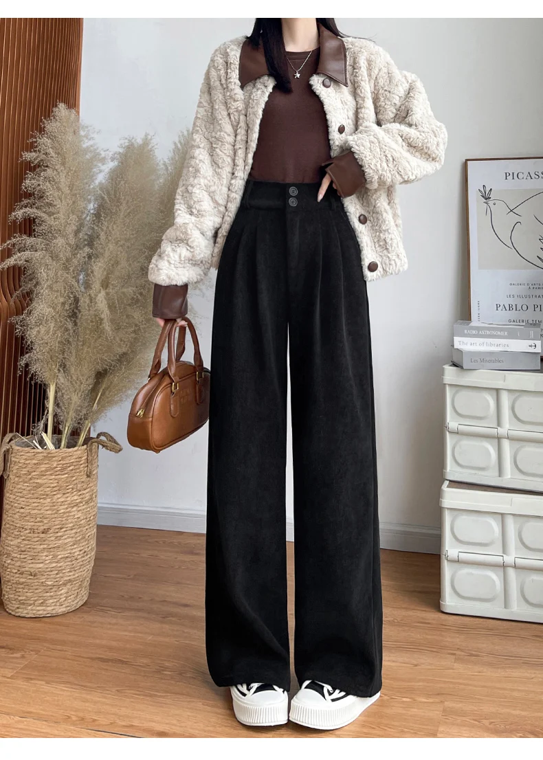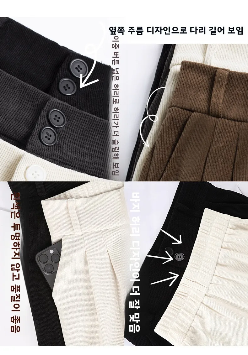 화이트 코듀로이 와이드 레그 팬츠 여성 가을 겨울 신상 슬림 스트레이트 드레이프 스몰 사이즈 플리스 안감 정장 바지 출퇴근 스타일 하이웨이스트
