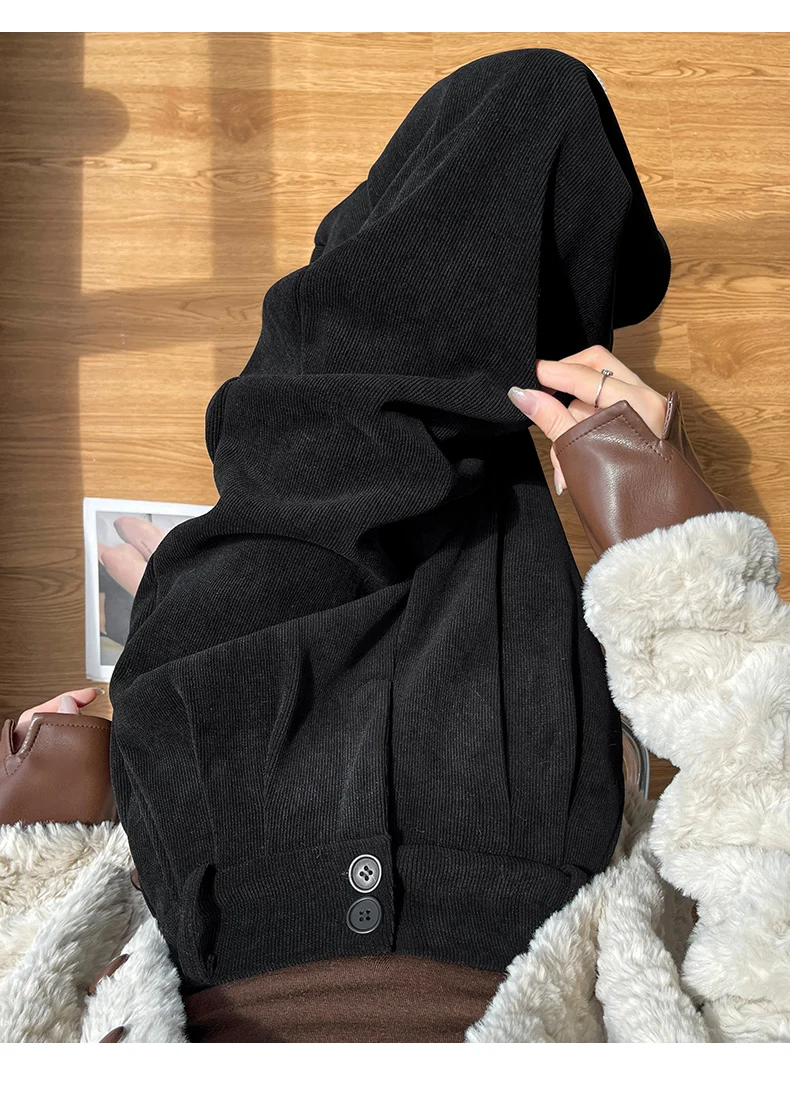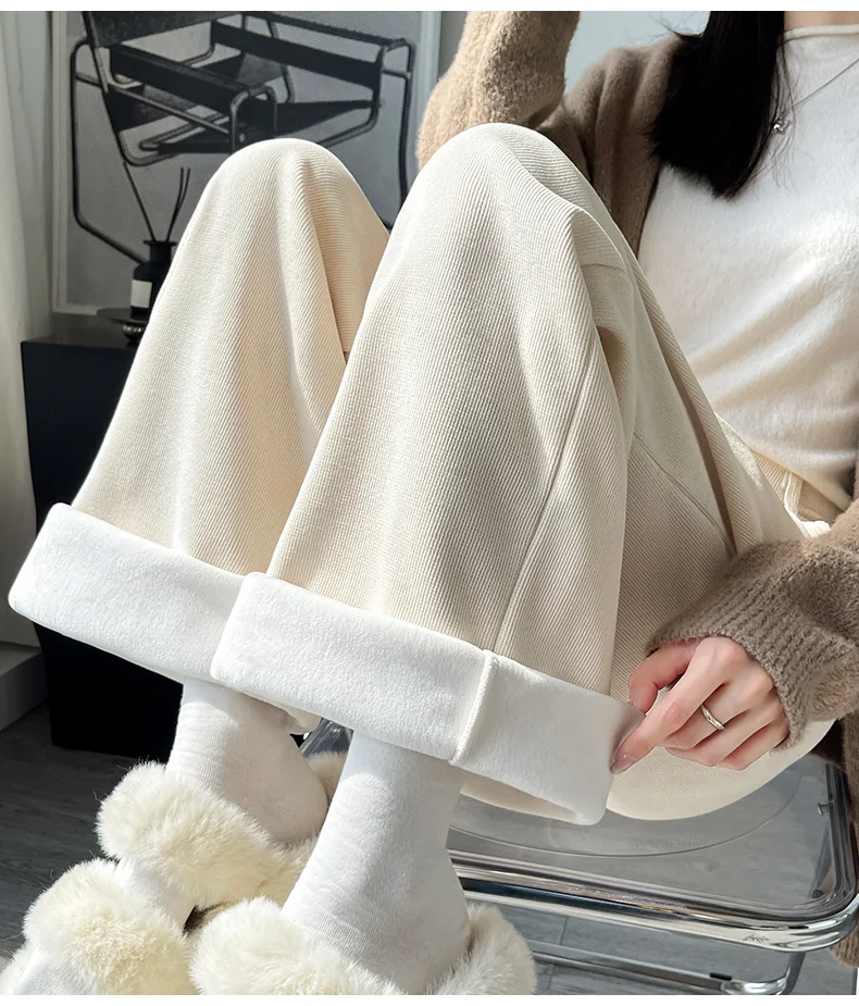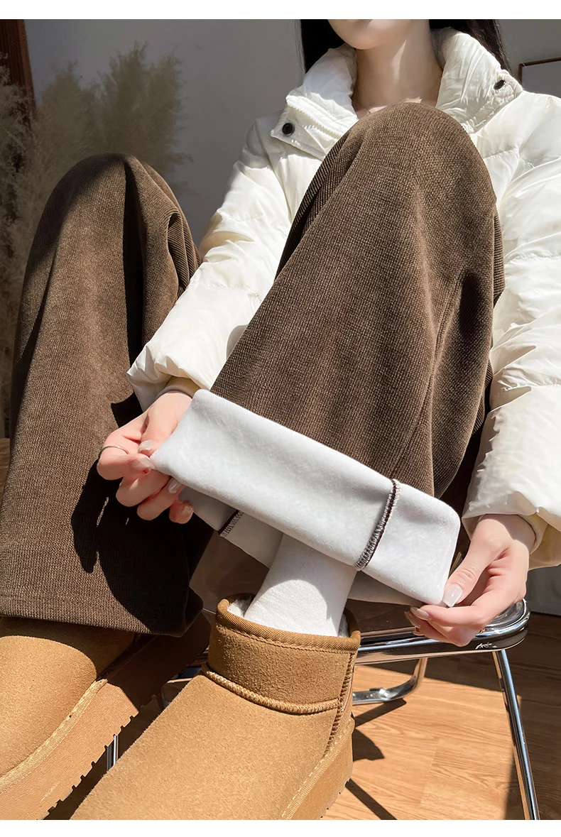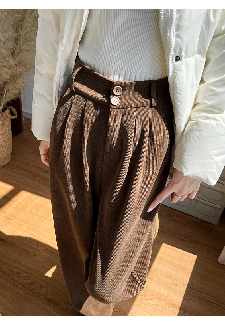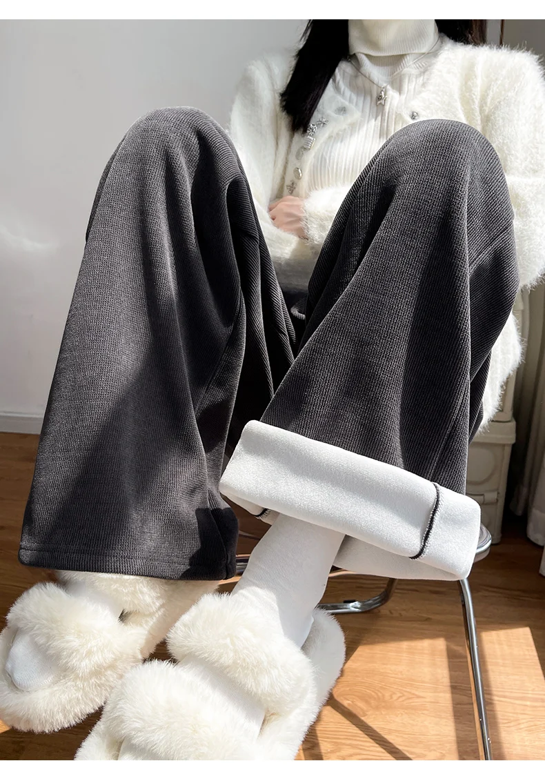화이트 코듀로이 와이드 레그 팬츠 여성 가을 겨울 신상 슬림 스트레이트 드레이프 스몰 사이즈 플리스 안감 정장 바지 출퇴근 스타일 하이웨이스트