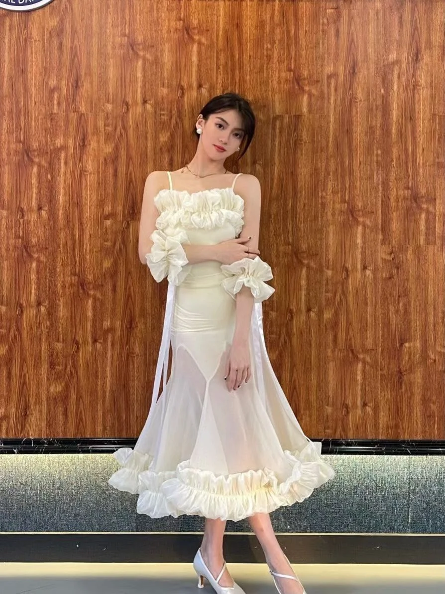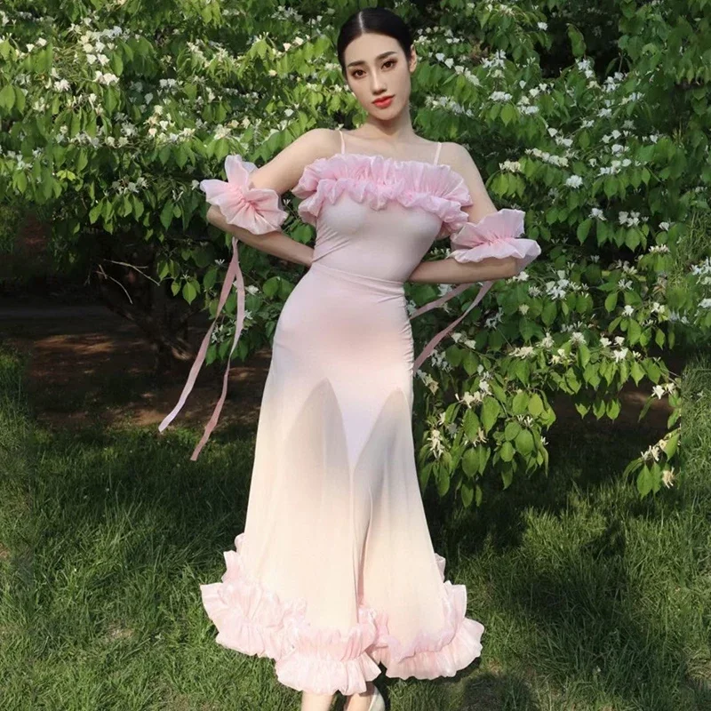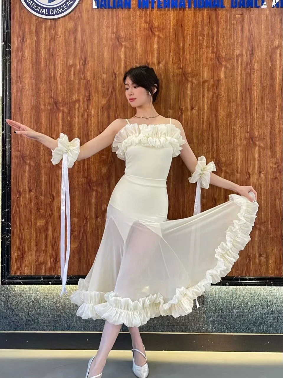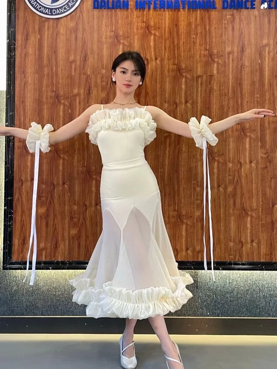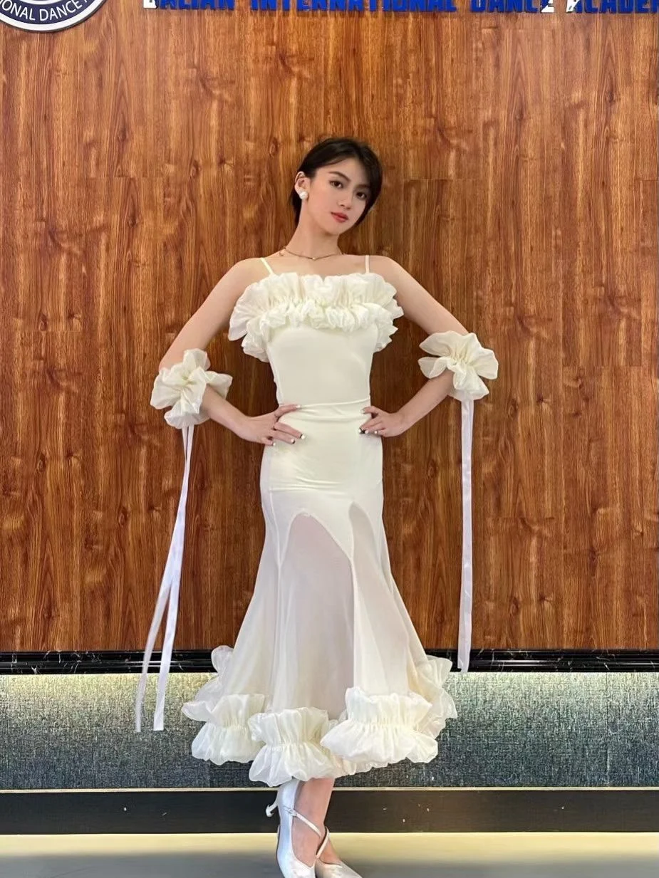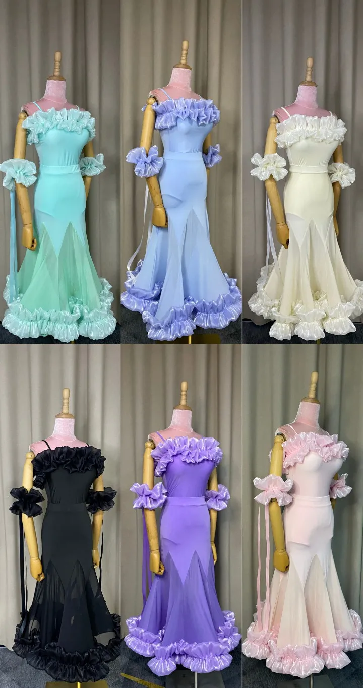 2022 볼룸 댄스 대회 드레스 여성 레이스 프릴 오프 숄더 탑 스커트 댄스 파티 드레스 왈츠 공연 의상 BL8621