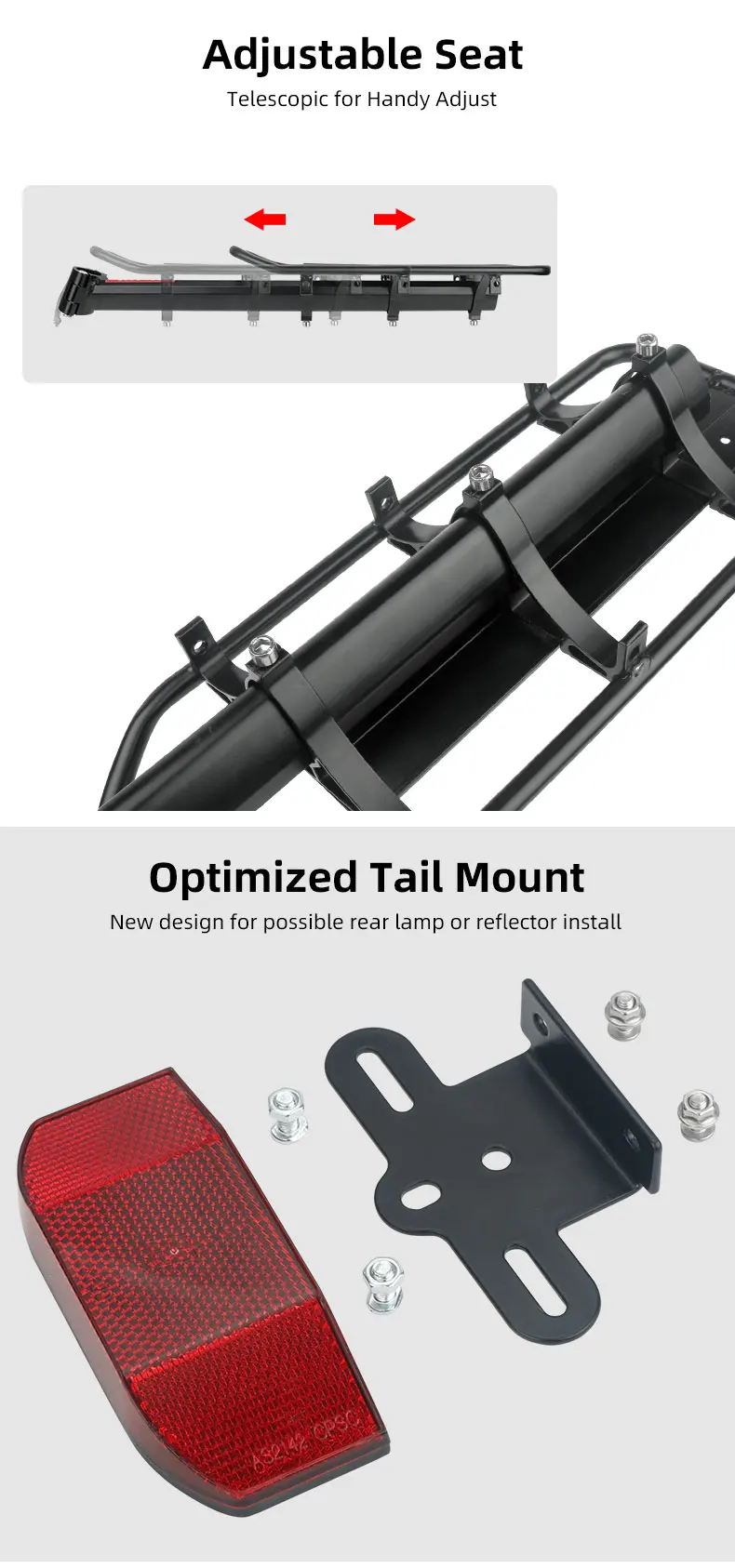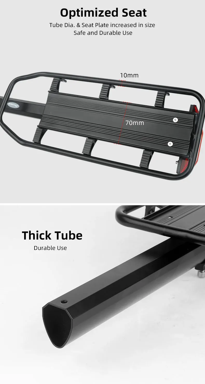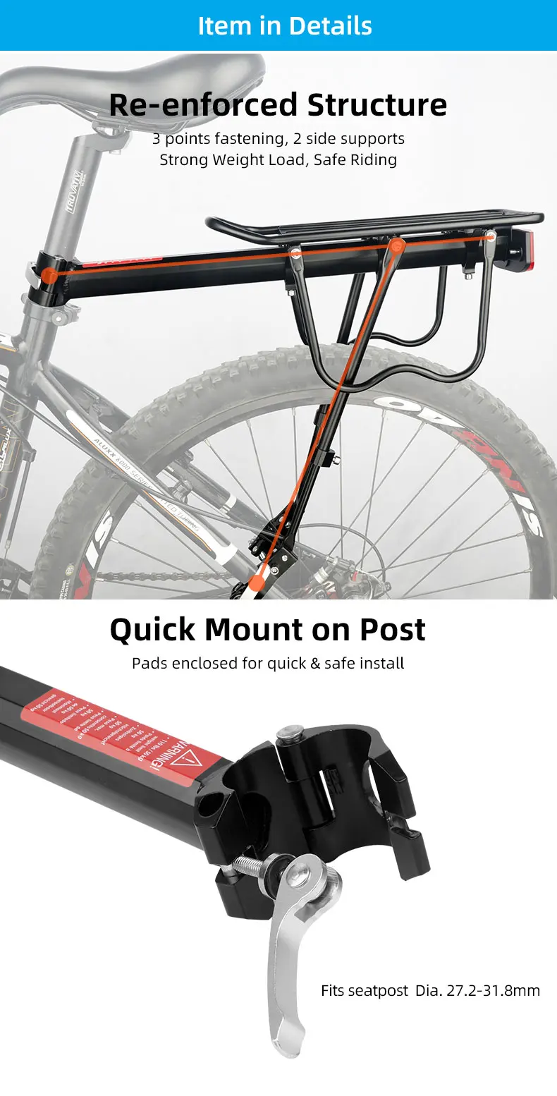 이 캐리어는 자전거 안전을 최우선으로 자전거에 50KG Max를 적재하는 것이 좋습니다. 성인의 체중 (예: 80KG) 을 적재 할 수있는 것처럼 보이지만 캐리어, 자전거 허브, 퀵 릴리스 로드 또는 프레임의 사이클링 손상 위험이 높습니다. 오랜 시간 작업 후 심각한 안전 결과를 초래할 수 있습니다. 용량을 로드하기 전에 기존 허브, 퀵 릴리스 로드 및 프레임 등의 로드 용량을 확인하시기 바랍니다.