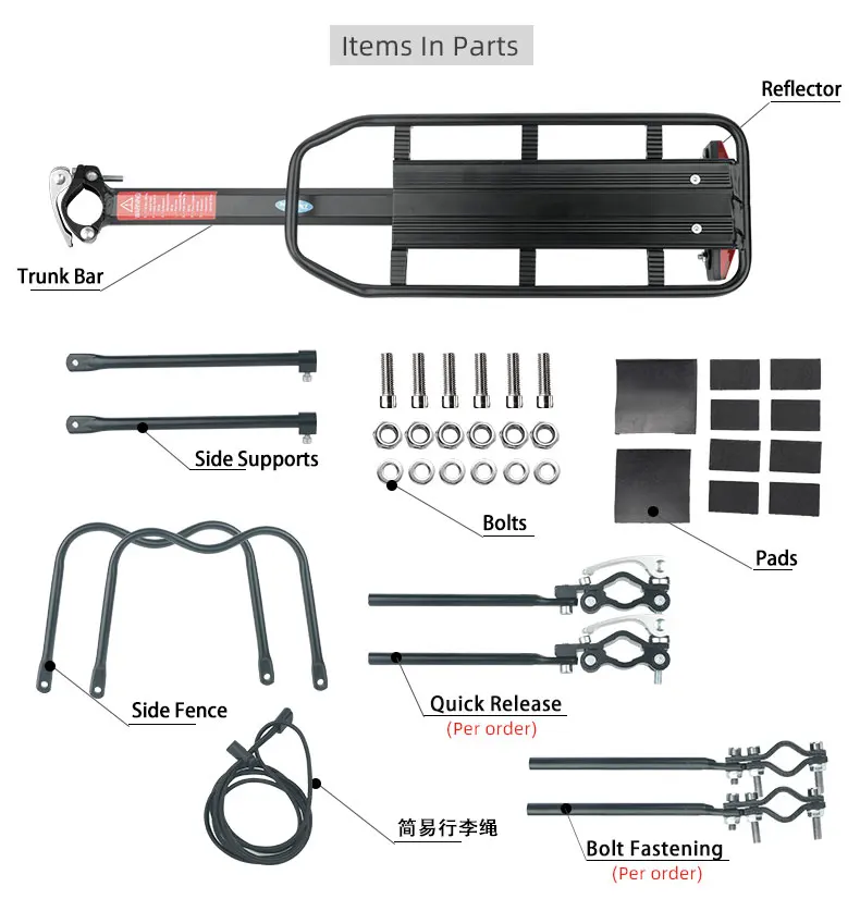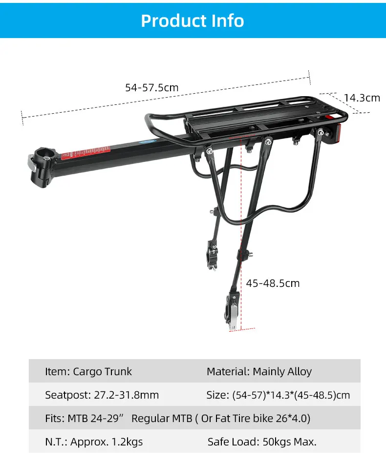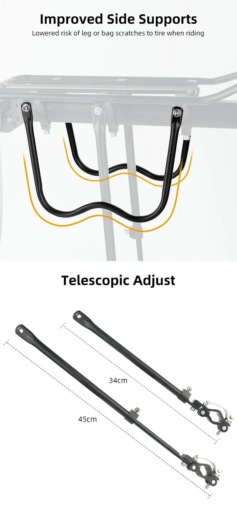 이 수하물 트렁크는 지지대와 함께 사용하도록 설계되었습니다. 짐을 싣기 전에 자전거에 풀 키트를 적절하고 단단히 장착하는 것이 좋습니다. 지지봉이 설치되지 않으면 부하 용량이 5-10KGS 로 크게 감소합니다.